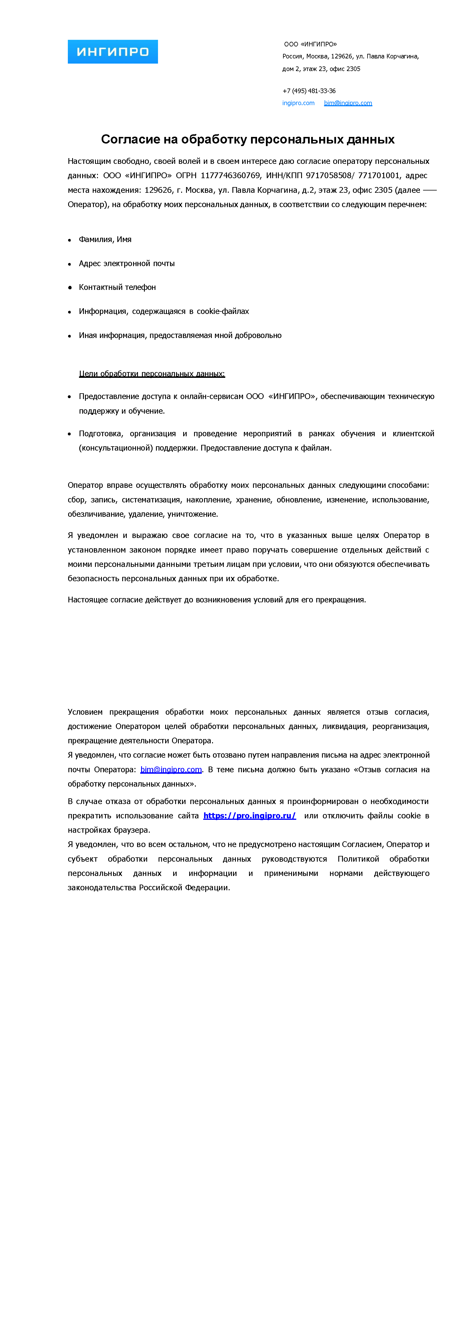| Согласие на обработку персональных данных | Политика в отношении обработки персональных данных и конфиденциальности | Аутентифицированные пользователи |